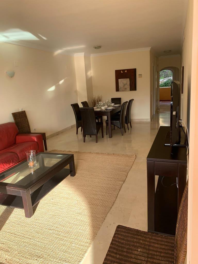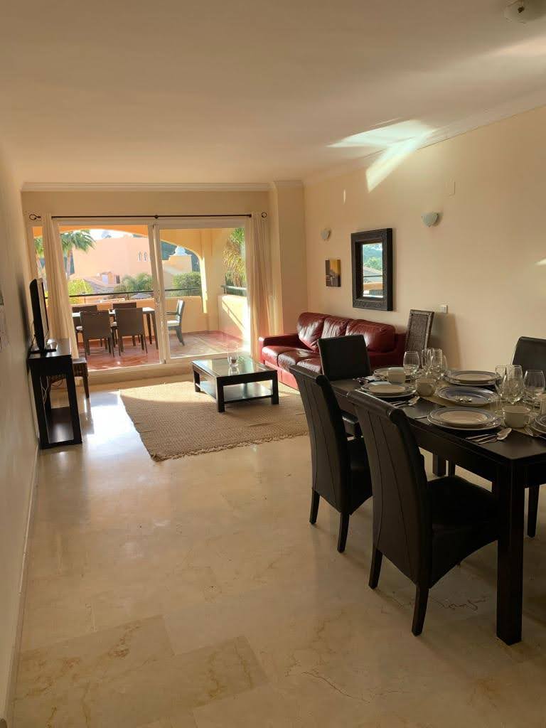El apartamento consta de 3 dormitorios de buen tamaño con amplios armarios empotrados, 3 amplios baños de mármol, amplia sala de estar/comedor, cocina totalmente equipada que incluye vitrocerámica, microondas, lavavajillas, horno y nevera, lavadero independiente y una gran terraza habilitada con mobiliario exterior para disfrutar todo el año con vistas abiertas al mar y a la vegetación.
