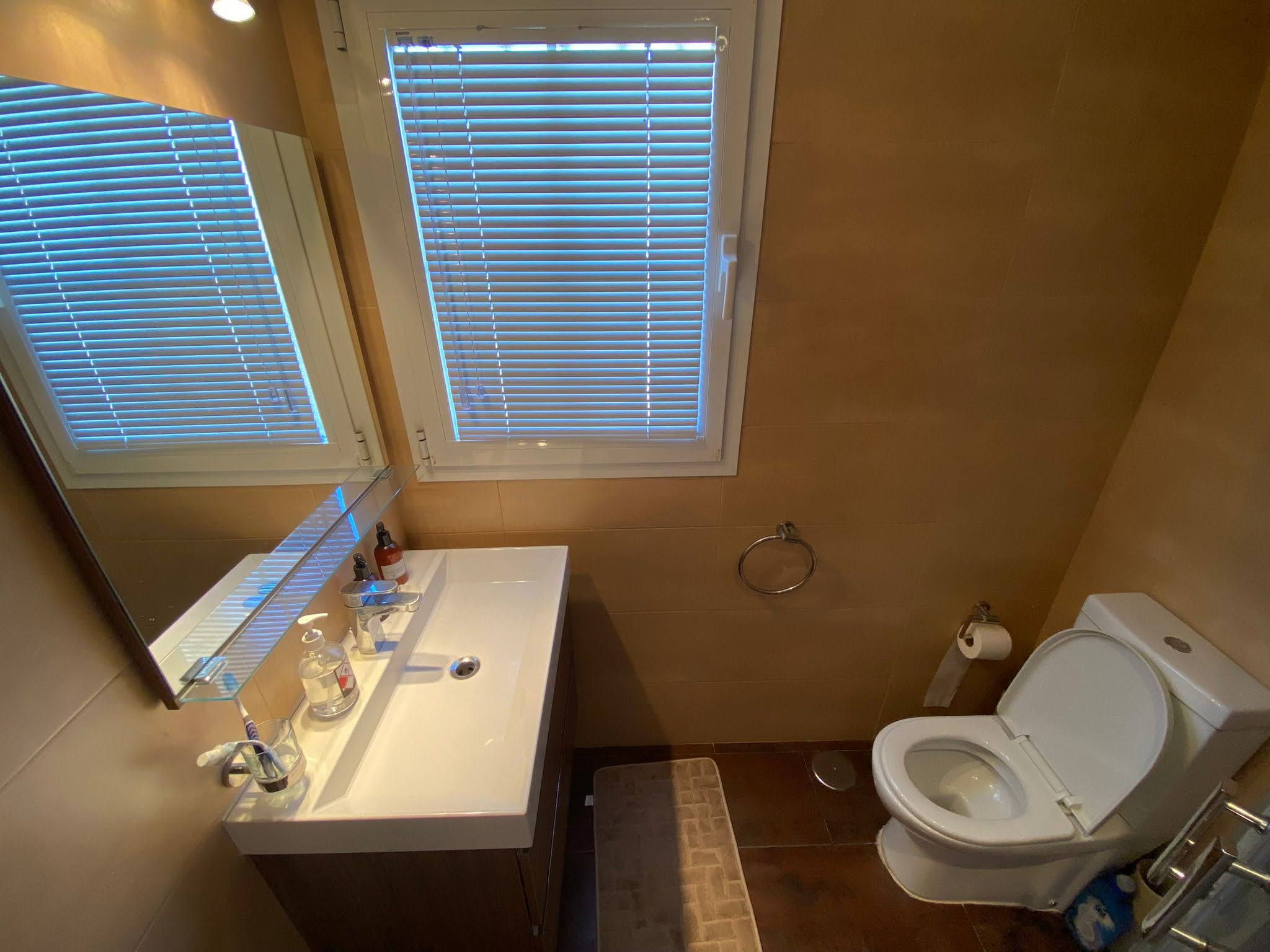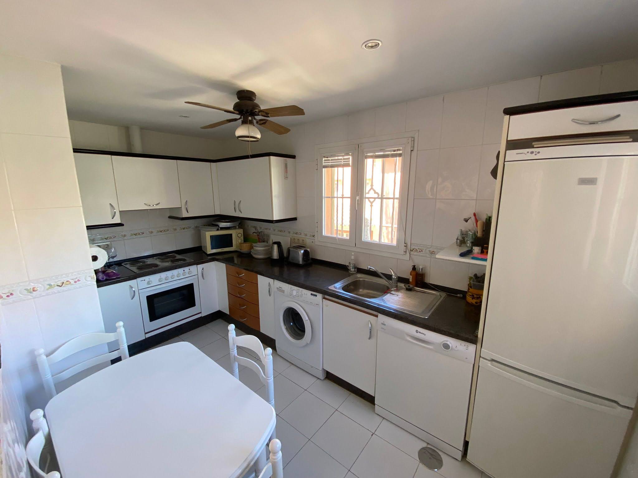 La vivienda de orientación sur cuenta con 110 m2 distribuidos en un hall de entrada, una amplia cocina equipada con electrodomésticos, amplio salón-comedor, dos dormitorios con armarios empotrados y acceso a la terraza, dos baños completos, una terraza en la planta baja y otra terraza en la azotea la cual goza de fantásticas vistas despejadas al mar, con zona de comedor exterior, fregadero y solarium.