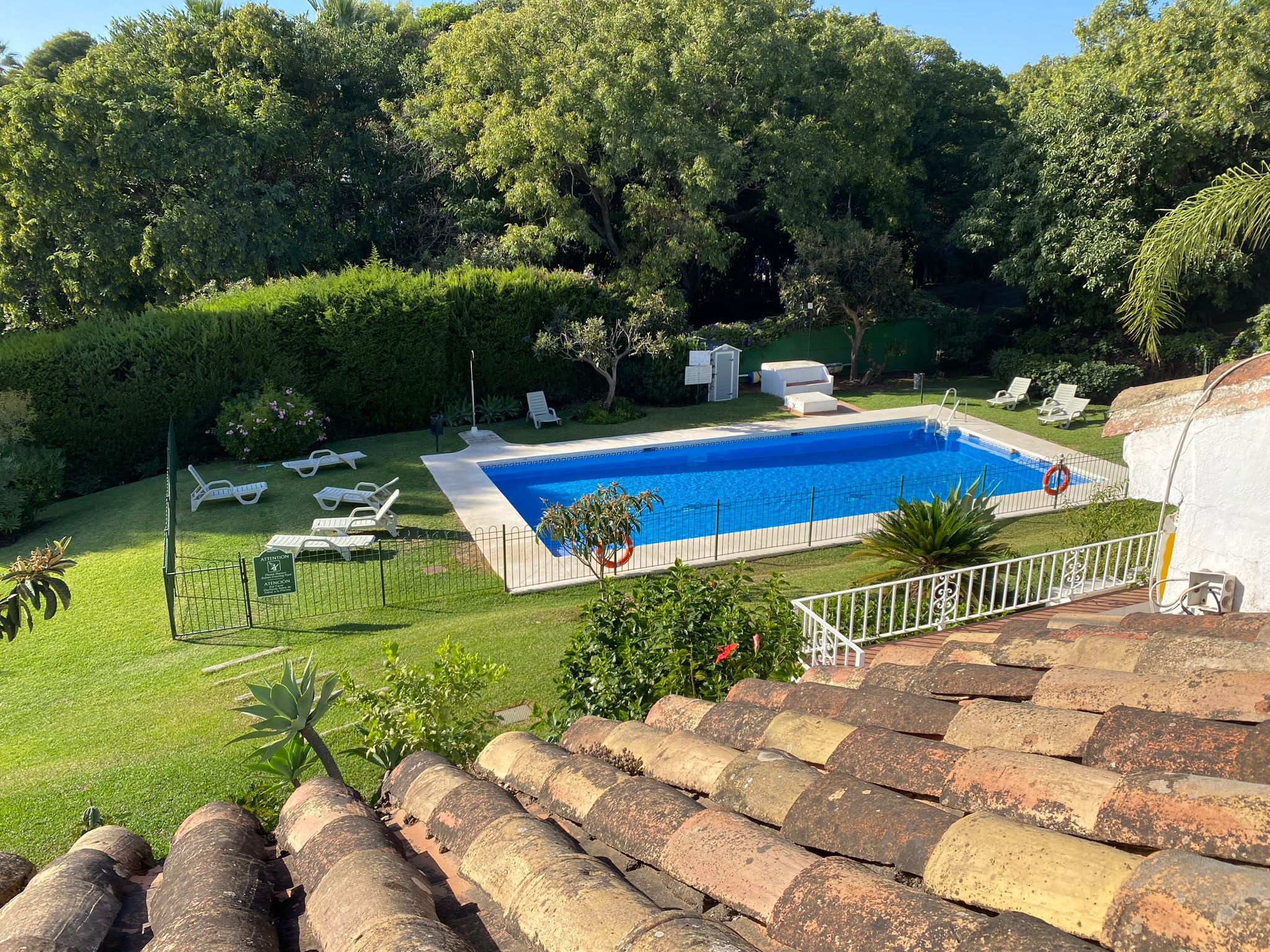 Urbanización cerrada con piscina y zonas verdes.