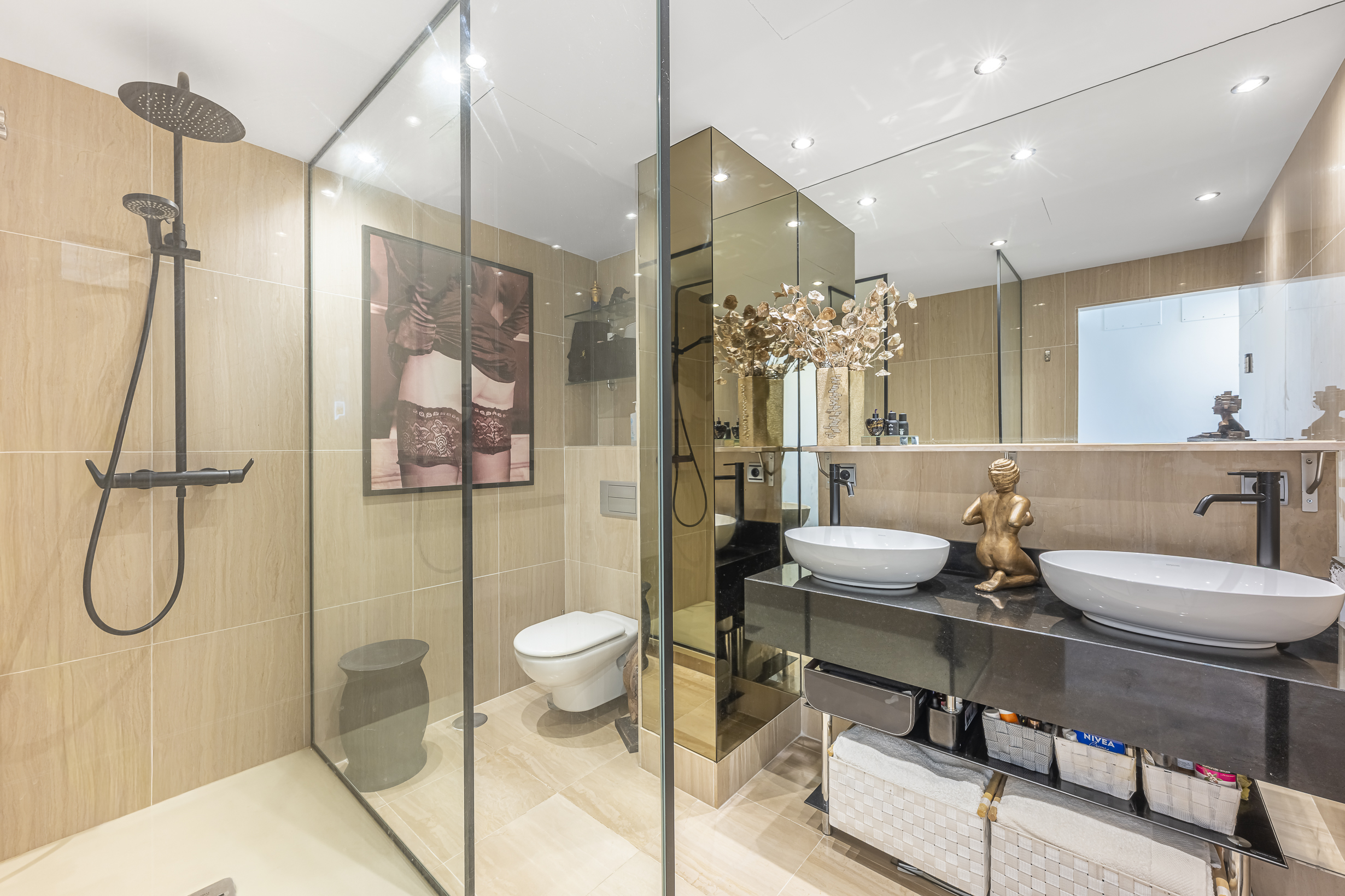 El apartamento tiene 264m2 construidos de los cuales 162m2 corresponden al interior, 33m2 a una terraza y 69m2 a la terraza superior donde se encuentra una piscina privada de 14m2.