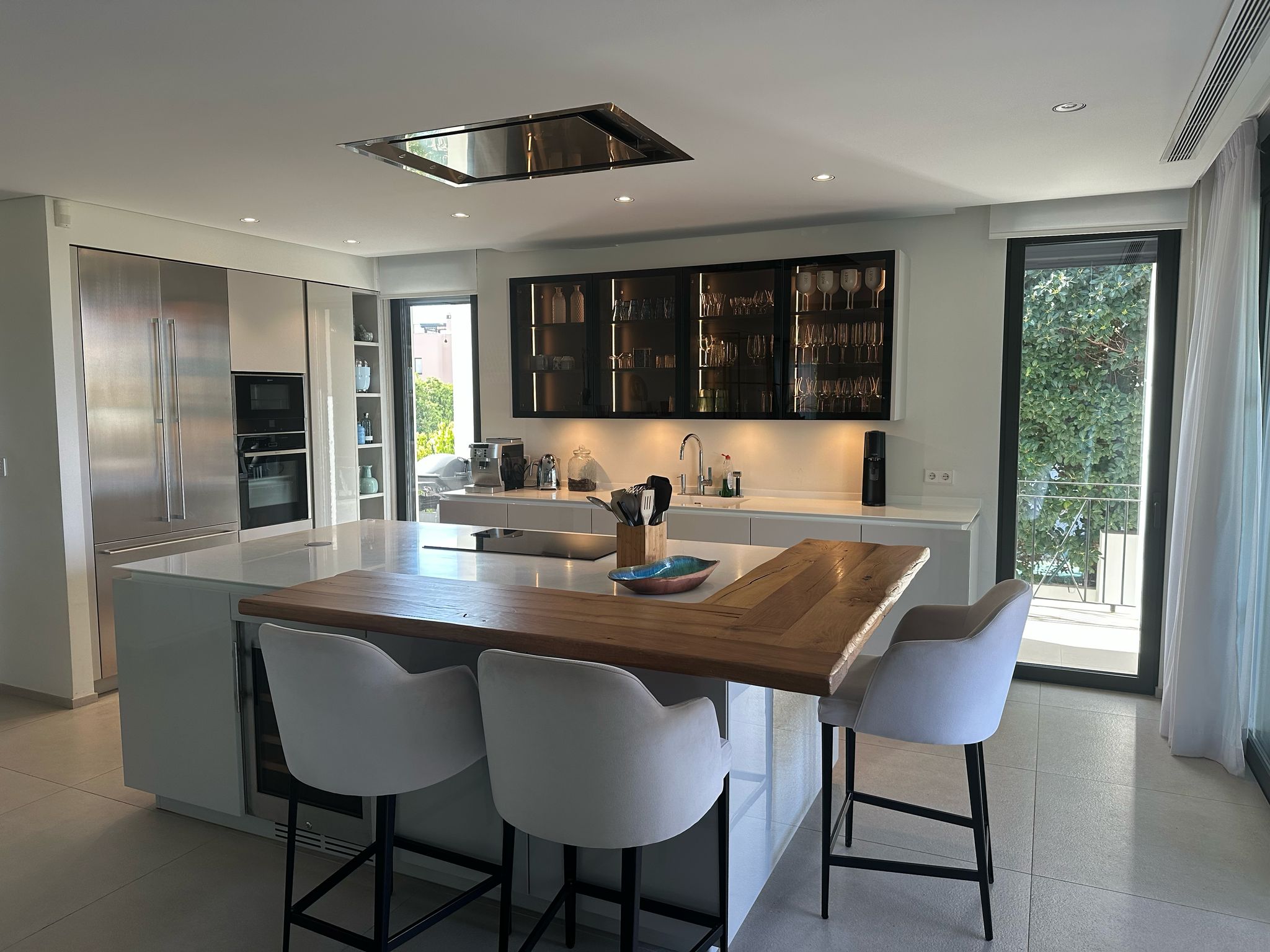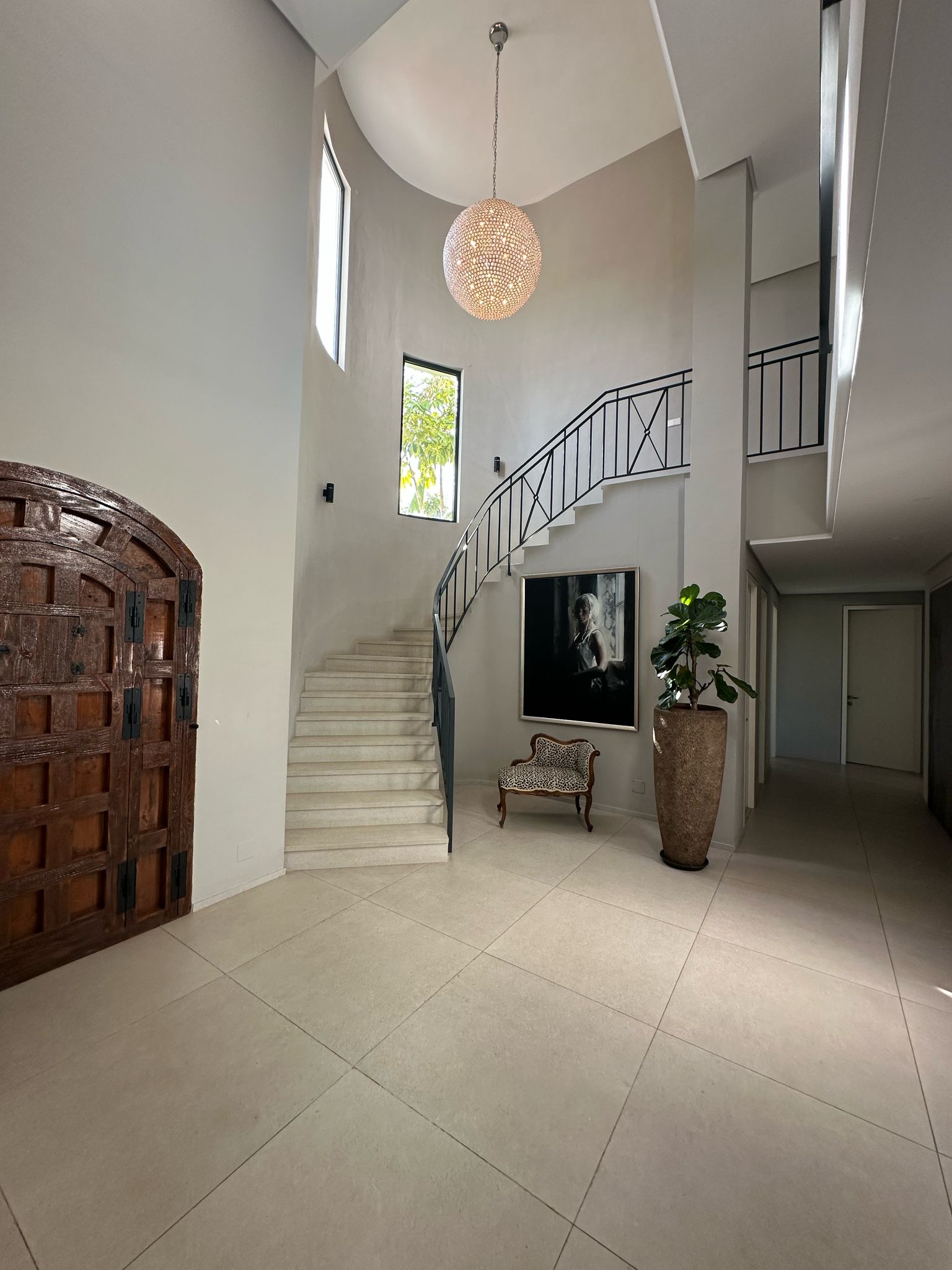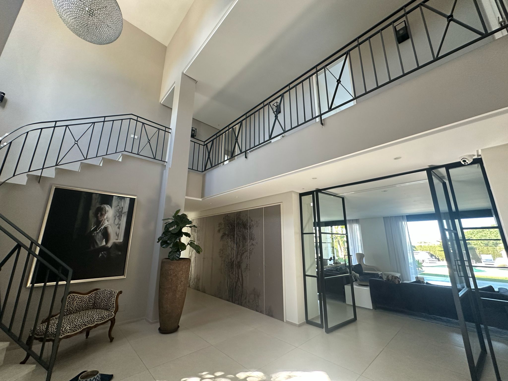 A la entrada de la villa nos encontramos con un amplio recibidor con techos de doble altura con grandes ventanales que inundan de luz natural todos los espacios interiores.