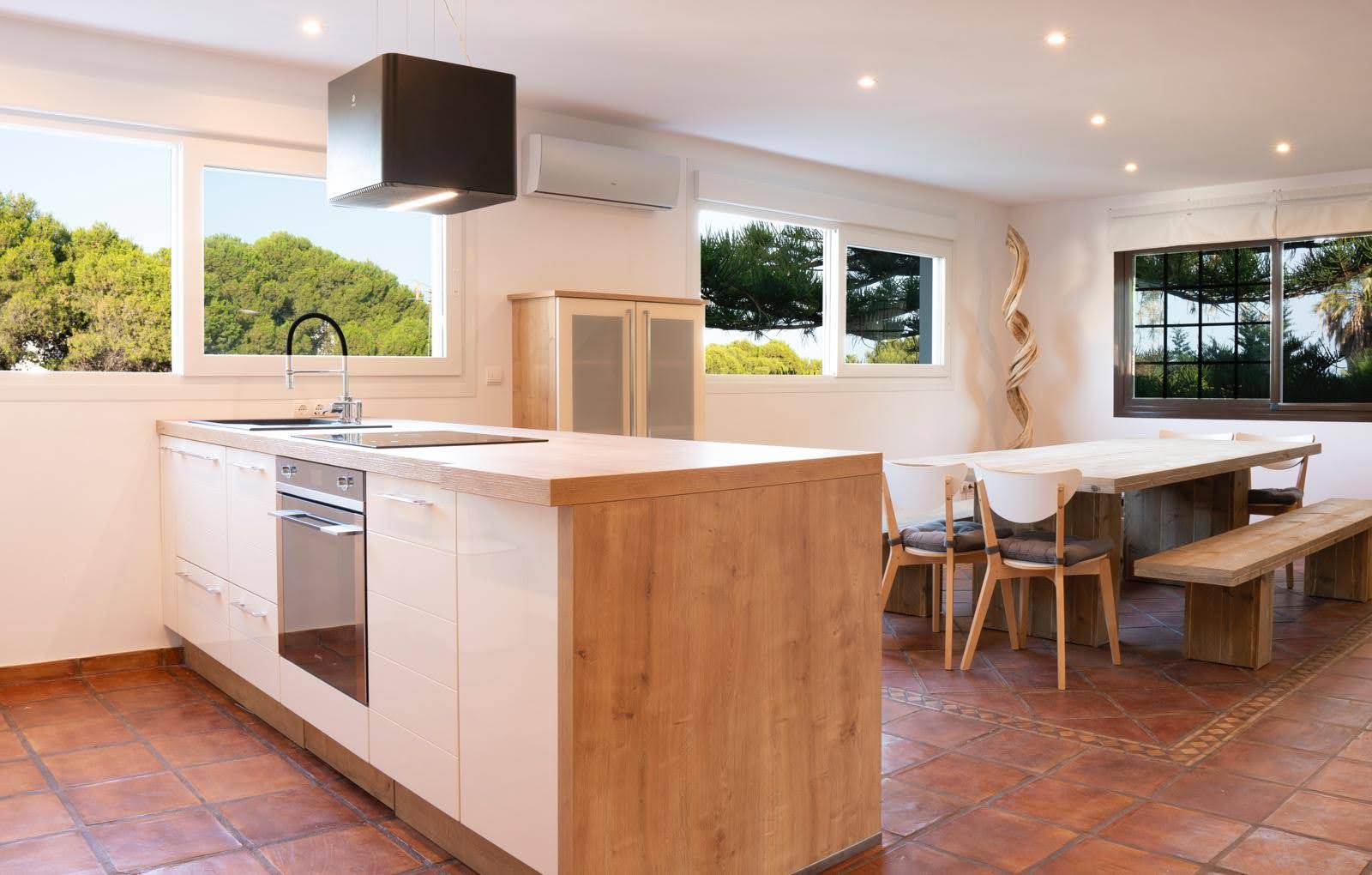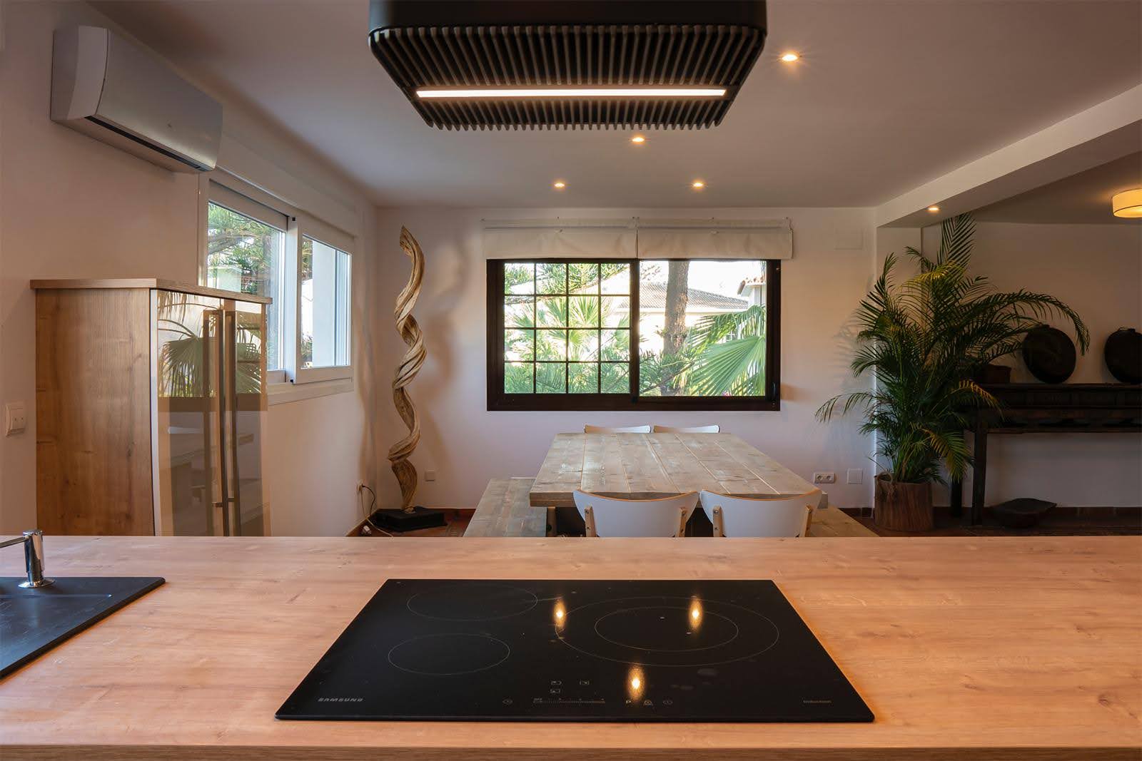 La vivienda cuenta con un gran espacio abierto en la planta baja compuesto un por salón con chimenea, zona de comedor, cocina muy moderna totalmente equipada, aseo de invitados, dos terrazas cubiertas con barbacoa y un extenso jardín con piscina privada. Garaje cubierto para 3 coches.
